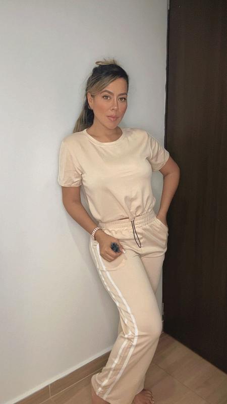 Set deportivo beige, cómodo y versátil. Camiseta suave y pantalón con líneas laterales que estilizan tu figura con un toque moderno y casual.