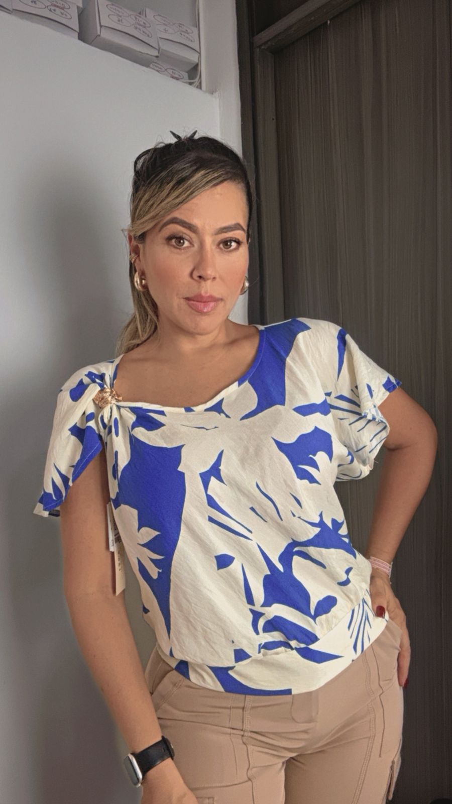 Blusa ligera y elegante, con caída suave y un hermoso herraje decorativo en el hombro. Estampado delicado en tonos azules que aporta frescura y estilo