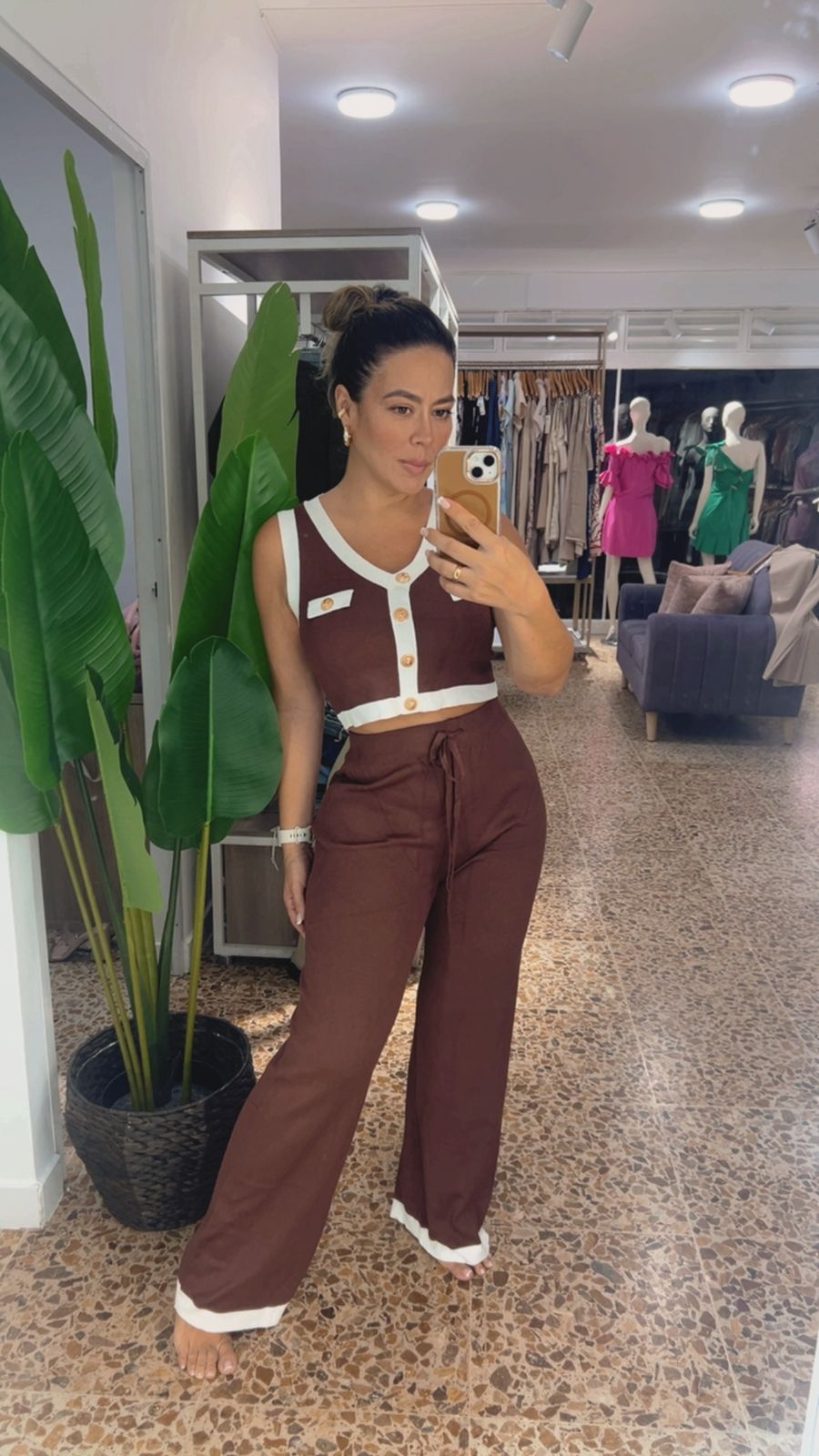 Set en hilo color café con top crop y pantalón fluido. Cómodo, fresco y moderno, ideal para looks casuales con estilo y elegancia en cualquier ocasión