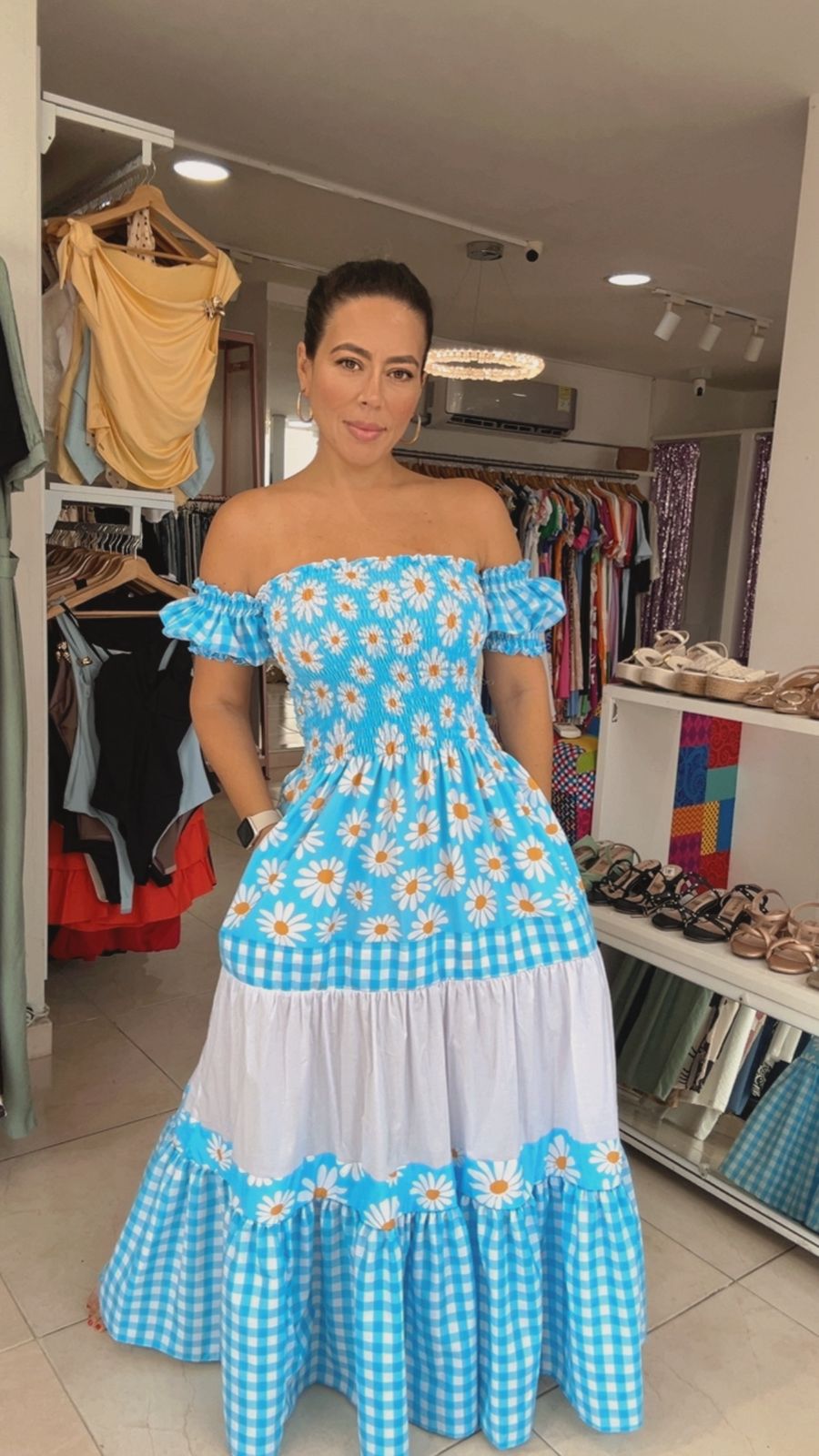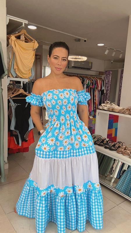 Vestido azul con estampado de margaritas, fresco y femenino. Su diseño Off shoulder y silueta amplia crean un look cómodo, coqueto y perfecto.