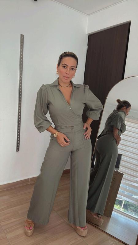 Set verde de blusa manga larga y pantalón, elegante y moderno, ideal para un look sofisticado y con mucho estilo.