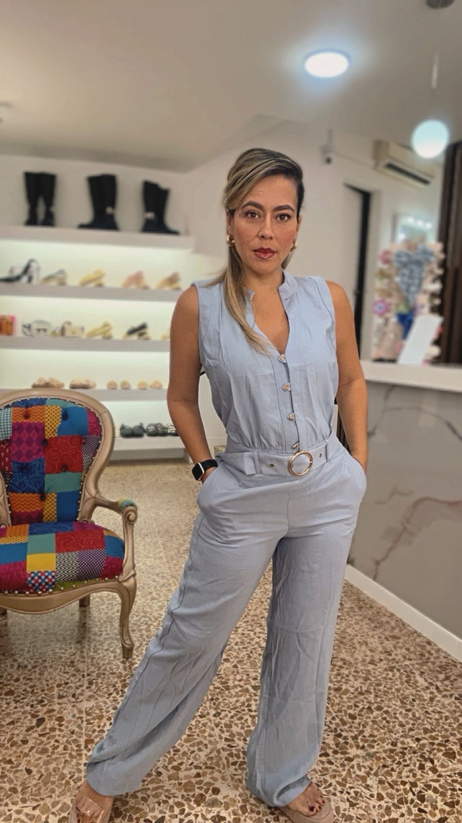 Enterizo azul bebé sin mangas, con botones frontales y cinturón metálico dorado. Su caída fluida y tono suave crean un look elegante, fresco y versáti