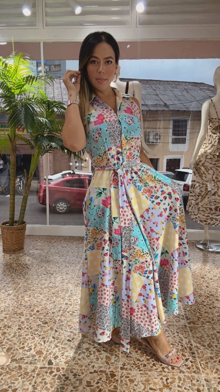 Vestido largo estampado tipo patchwork con cuello camisero y lazo en la cintura. Fresco, femenino y perfecto para un look alegre y elegante.