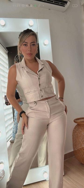 Set beige elegante y fresco, con chaleco y pantalón de corte moderno. Tela cómoda que estiliza la figura. Ideal para un look sofisticado y versátil.