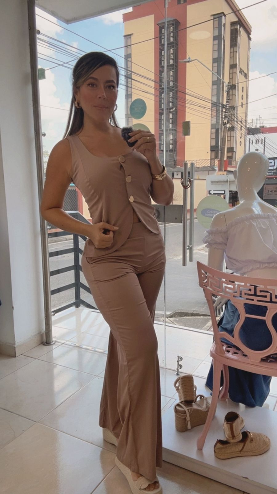 Hermoso set en tono café con pantalón y chaleco a juego. Diseño elegante y femenino, en tela fresca y cómoda que realza tu figura con un estilo