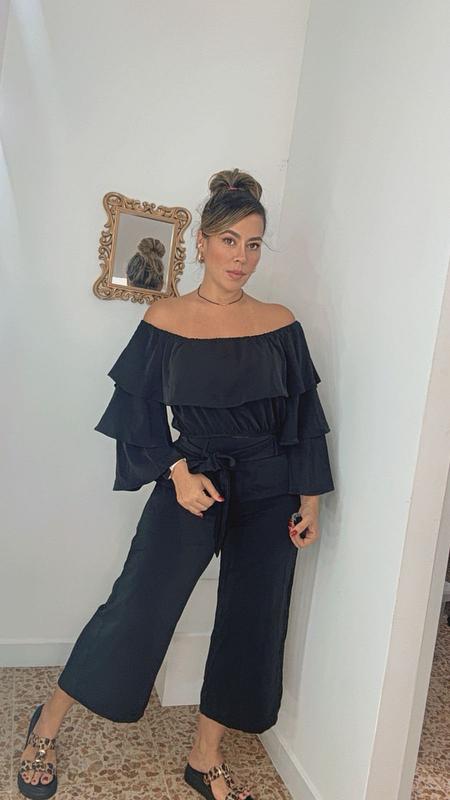 Set negro con blusa off shoulder de capas y pantalón fluido. Elegante, cómodo y versátil, ideal para eventos salidas o looks sofisticados