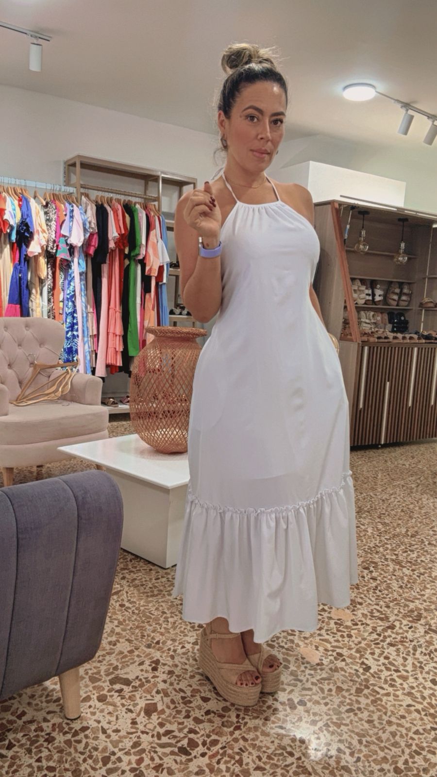 Vestido blanco elegante con cuello anudado y pequeño cut-out frontal. Femenino, sofisticado y tiene un escote bajo en la espalda