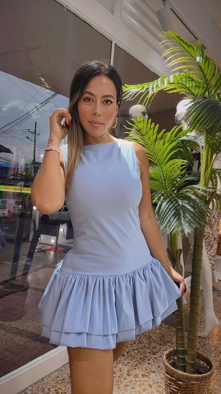 Vestido corto azul cielo de corte elegante con falda de boleros. Un diseño moderno y femenino que realza la silueta con un estilo chic y sofisticado.