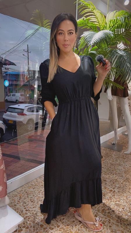 Vestido largo negro con escote en V, mangas hasta el codo y cintura ajustable. Un diseño elegante y cómodo que realza la silueta con estilo.