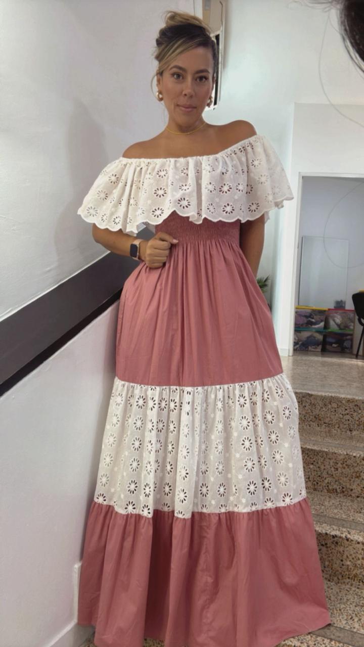 Vestido tipo campesino con detalles de encaje en blanco y rosado palo rosa. Femenino, delicado y fresco, ideal para días soleados y looks románticos