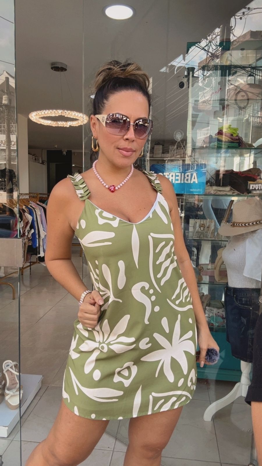 Vestido corto verde con estampado tropical, fresco y cómodo, ideal para días soleados. Su diseño ligero resalta figura y aporta natural.