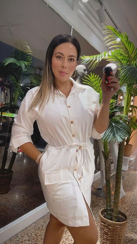 Vestido corto marfil con botones frontales, bolsillos y cintura ajustable. Un diseño moderno, cómodo y versátil para lucir elegante todos los días.